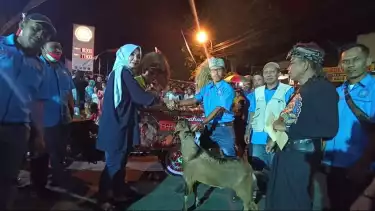 Menerima hadiah kambing dari mantan Sekdakab Jombang tersebut, Yudi, seorang PKL, menyembut dengan senyum bangga.
