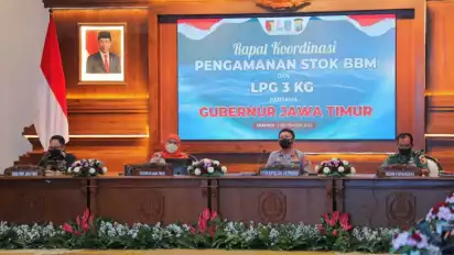 Surabaya, Jawa Timur - Pastikan ketercukupan kebutuhan masyarakat akan bahan bakar minyak (BBM) dan gas LPG 3 kg, Gubernur Jawa Timur, Khofifah Indar Parawansa, menggelar rapat koordinasi, bersama Kapolda Jatim, Kodam V Brawijaya, Bupati dan Walikota se Jatim, serta para Kapolres jajaran Polda Jatim, yang juga dihadiri oleh Executive GM Pertamina Patra Niaga Jatimbalinus, di Gedung Negara Grahadi, Surabaya.
