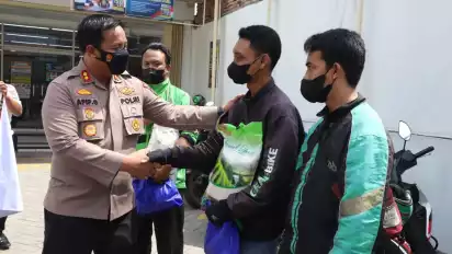 Gelar Bakti Sosial, Polres Mojokerto Bagikan Sembako ke Tukang Ojek yang Terdampak Penyesuaian Harga BBM