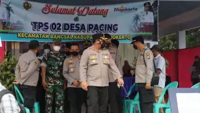 Mojokerto, Jawa Timur - Sebanyak 1591 personil gabungan TNI, POLRI, Satpol PP dan Linmas dikerahkan untuk melakukan pengamanan Pilkades Serentak di wilayah Hukum Polres Mojokerto, pada 203 TPS di 33 desa.