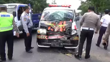 Madiun, Jawa Timur - Sebuah mobil ambulans yang membawa jenazah dari Sidoarjo tujuan Ponorogo menabrak Bus Sugeng Rahayu jurusan Jogjakarta-Surabaya saat keluar dari Terminal Bus Purbaya Madiun, Senin (19/9) sekitar pukul 11.30 WIB.