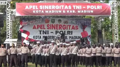 Madiun, Jawa Timur - Ratusan personel TNI-Polri se Kota dan Kabupaten Madiun, Rabu (21/9) menggelar apel pasukan, guna menjalin kekompakan dan sinergitas bersama dalam menjaga kamtibmas yang aman dan kondusif, baik dari kerusuhan antar pendekar maupun adanya gejolak masyarakat dampak kenaikan bbm, di Lapangan Tribrata Mapolres Madiun.