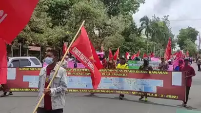 Blitar, Jawa Timur - Ratusan massa yang tergabung dalam Front Perjuangan Petani Mataraman (FPPM) menggelar aksi unjuk rasa di depan kantor Perhutani KPH Blitar pada Selasa (27/9) siang. Mereka meminta Perhutani berkomitmen tidak mengusik petani penggarap lahan yang sudah diambil alih oleh Kementrian Lingkungan Hidup dan Kehutanan (KLHK) untuk dijadikan Kawasan Hutan Dengan Pengelolaan Khusus (KHDPK).