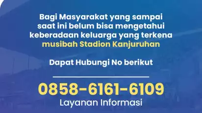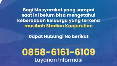 "Bagi masyarakat yang sampai saat ini belum bisa mengetahui keberadaan keluarga yang terkena musibah stadion kanjuruhan dapat menghubungi nomor berikut; 0858-6161-6109," demikian bunyi selebaran yang dibagikan Dinkes Kabupaten Malang, yang diterima tim tvone di Malang, Kamis (5/10/2022).