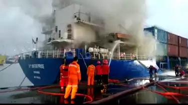 Sebuah kapal kontainer terbakar saat bersandar di Pelabuhan Jamrud Selatan. Ada belasan unit kendaraan damkar Kota Surabaya dikerahkan untuk proses pemadaman