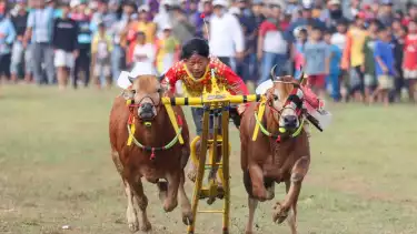 Bangkalan, Jawa Timur - Karapan Sapi Tradisional memperebutkan Piala Bergilir Presiden RI di lapangan Stadion Keparan Sapi Moh. Noer Kabupaten Bangkalan, dipadati penonton. Kegiatan yang bertepatan dengan Hari Jadi Provinsi Jawa Timur ke-77 tahun, menjadi kebanggaan tersendiri bagi pencinta balapan sapi.