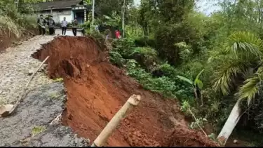"Kejadiannya baru tadi pagi mas, tiba-tiba jalannya longsor, memang tadi malam diguyur hujan deras," ungkapnya.Â