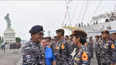Surabaya, Jawa Timur - Berlayar arungi Lautan Pasifik 91 hari, Dermaga Madura Ujung Surabaya, jadi akhir perjalanan KRI Bima Suci. Misi pelayaran membawa 208 awak kapal, yang terdiri dari 92 ABK, 102 Taruna AL, dan 14 orang staf latihan.