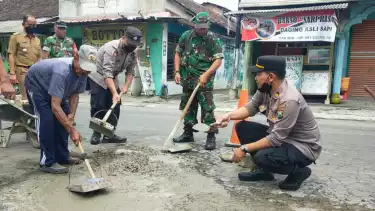 Iptu Nur Budi Santoso, Kapolsek Nglegok mengatakan warga bersama Polsek, Koramil dan Kecamatan Nglegok berinisiatif menambal jalan rusak di depan Pasar Nglegok dengan cor semen.