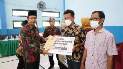 Sidoarjo, Jawa Timur - Puluhan guru siswa SMP Negeri se Kabupaten Sidoarjo yang menjadi korban bencana angin puting beliung, mendapatkan bantuan dari MKKS (Musyawarah Kerja Kepala Sekolah) SMP Negeri Sidoarjo. Secara simbolis bantuan itu diserahkan langsung oleh Bupati Sidoarjo, Ahmad Muhdlor Ali di Aula SMPN 2 Sidoarjo.