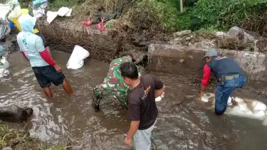Tanggul Jebol Diterjang Banjir, TNI dan Warga Benahi Gunakan Karung Pasir dan Patok Bambu
