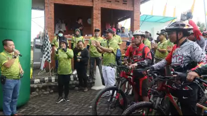 Sebelum mengibarkan bendera start tanda peserta kegiatan berangkat dari garis start, Bupati Ikfina lebih dulu menyambut para peserta baik dari Kabupaten Mojokerto atau pun kota-kota tetangga.