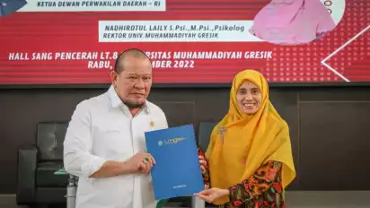 Gresik, Jawa Timur - Rektor Universitas Muhammadiyah Gresik (UMG), Nadhirotul Laily menitipkan aspirasi kepada Ketua DPD RI, AA LaNyalla Mahmud Mattalitti untuk diperjuangkan. Aspirasi itu disampaikan saat Ketua DPD RI mengisi kuliah umum wawasan kebangsaan di UMG, Rabu (21/12).Â
