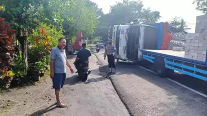 Diduga Rem Blong, Tronton Pengangkut Bata di Banyuwangi Terguling