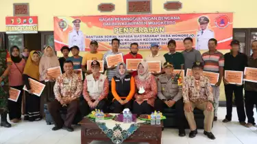 Mojokerto, Jawa Timur - Bupati Mojokerto, Ikfina Fahmawati menyerahkan secara langsung bantuan sosial (Bansos) kepada 18 warga Kecamatan Trowulan, yang terdampak musibah angin kencang. Penyerahan Bansos tersebut berlangsung di Pendopo Kantor Kepala Desa Wonorejo, Kecamatan Trowulan, Kamis (29/12) siang.