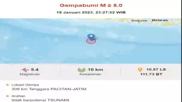 Dalam hal ini, BMKG melaporkan bahwa gempa itu terjadi pada Rabu (18/1/2023) pukul 23.27 WIB. Titik koordinat gempa terjadi pada 10.87 LS, 111.73 BT (Pusat gempa berada di laut 306 km tenggara Pacitan), Kedalaman: 10 Km Dirasakan (MMI) II Trenggalek. (aag)