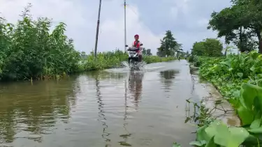 Lamongan, Jawa Timur - Hujan deras yang mengguyur wilayah Lamongan, Rabu (01/02) kemarin mengakibatkan sejumlah titik ruas jalan di tiga kecamatan terendam banjir. Jalan poros yang terendam banjir tersebut diantaranya jalan poros Desa Gambuhan menuju Desa Bojoasri, Kecamatan Kalitengah. Di titik lokasi ini, banjir setiap tahun terjadi lantaran sungai lebih tinggi dari jalan.