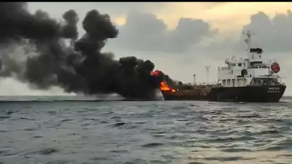 Mataram, tvOnenews.com - Kapal tangker pengangkut BBM jenis Pertalite, MT. Cristin mengalami kebakaran saat hendak loading BBM di Depo Pertamina Ampenan.