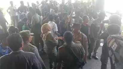 Massa semakin emosi mencoba menembus blokade aparat. Saling dorong tak bisa dihindari, bahkan konflik fisik pun terjadi antara pendemo dan Satpol PP. Beberapa pentolan aksi terluka termasuk Kordinator Umum, Rudini. Seorang pendemo pingsan.