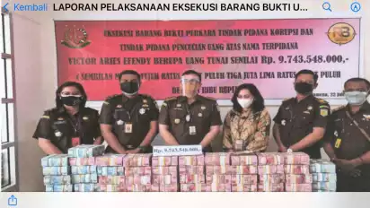 tvonenewsBahwa terkait Barang Bukti berupa uang tunai senilai Rp.9.743.548.000,- (Sembilan Milyar Tujuh Ratus Empat Puluh Tiga Juta lima ratus empat puluh delapan ribu Rupiah) yang merupakan dari hasil kejahatan Terpidana VICTOR ARIES EFENDY yang disita oleh Penyidik selanjutnya pada saat penyerahan Tersangka dan Barang Bukti dari Penyidik Polda Papua kepada Penuntut Umum Kejaksaan Negeri Jayawijaya kemudian barang bukti tersebut dititipkan pada rekening titipan Kejaksaan Negeri Jayawijaya atas nama RPL PDT KEJARI JAYAWIJAYA pada Bank BNI Cabang Wamena dengan nomor rekening: 4442221133, selanjutnya berdasarkan Putusan Kasasi Mahkamah Agung RI Nomor : 1640 K/ Pid. Sus / 2020 tanggal 28 Juli 2020 yang telah berkekuatan hukum tetap, barang bukti uang tersebut disetorkan ke kas negara (bukti terlampir).