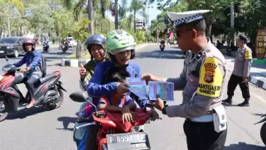 Polres Sumbawa membagikan brosur pada Operasi Zebra Rinjani 2023 untuk mensosialisasikan tata tertib lalu lintas kepada masyarakat.