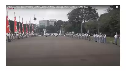 tvOnenews.com - Presiden Republik Indonesia Prabowo Subianto memimpin langsung upacara kenegaraan untuk menyambut kedatangan Perdana Menteri Australia, Anthony Albanese, di Istana Merdeka, Jakarta, Selasa (15/5). Upacara tersebut berlangsung khidmat, ditandai dengan 19 dentuman meriam sebagai bentuk penghormatan tertinggi bagi kepala pemerintahan negara sahabat.