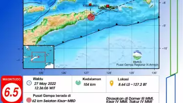 Ambon, Maluku - Guncangan gempa berkekuatan magnitudo 6,5 terjadi di wilayah Maluku Barat Daya (MBD), Provinsi Maluku, Jumat (27/05/2022) sekitar pukul 09.36 Wib. Pusat gempa tektonik tersebut tepatnya berlokasi di laut pada jarak 87 km barat daya Maluku Barat Daya, Maluku dengan kedalaman 53 km. Hasil analisis BMKG yang diterima media ini menunjukkan gempa bumi ini memiliki parameter update dengan magnitudo M 6,4.