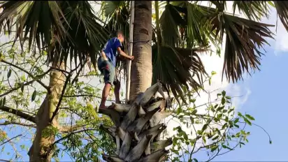 Setelah pohon pertama, bocah kelahiran 27 Januari 2020 ini pun turun dan langsung kembali memanjat pohon yang lain dengan ketinggian sekitar 8 meter.