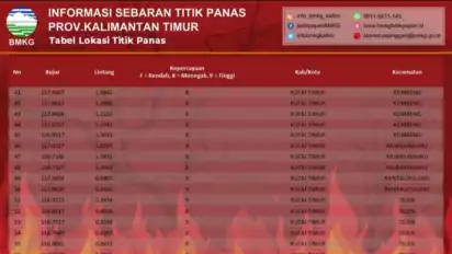 Adapun delapan daerah yang terdeteksi 73 titik panas itu adalah di Kota Balikpapan ada 1 titik, Samarinda 1 titik, Kabupaten Paser 2 titik, Kutai Timur ada 27 titik, Kutai Barat ada 2 titik, Kutai Kartanegara 20 titik, Berau 10 titik, dan Kabupaten Mahakam Ulu ada 10 titik panas.