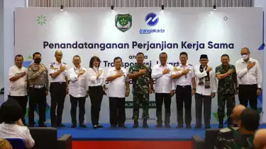 Jakarta - PT Transportasi Jakarta (TransJakarta) melakukan penandatanganan perjanjian kerja sama dengan Tentara Nasional Indonesia Angkatan Darat (TNI AD) Kodam Jaya, di Aula GBK, Kantor Pusat TransJakarta, Jakarta Timur.
