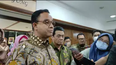 Dengan mengenakan kemeja dan rompi biru, Anies melayat didampingi Sekretaris Daerah Marullah Matali dan Wali Kota Jakarta Selatan Munjirin.