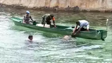Baubau, tvOnenews.com - Seorang Anggota Polisi dari Bhabinkamtibmas Bripka Mukhsin Azis dan Anggota TNI dari Babinsa Kodim 1413 Buton Sertu Bardin melakukan aksi penyelamatan penyu hijau berukuran besar yang terikat tali di pesisir pantai di Pasar Wameo, Kota Baubau, Sulawesi Tenggara.