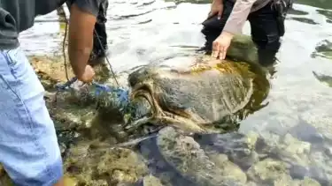 "Evakuasi yang kami lakukan ini setelah ada laporan warga yang melihat penyu itu terlilit tali, entah apakah ada orang yang sengaja ikat atau memang terjebak dalam lilitan tali itu," kata Bripka Mukhlis saat ditemui, Rabu (5/4/2023).