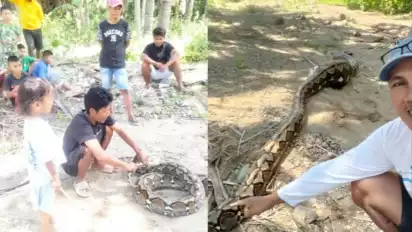 "Ini sudah ular ketiga yang ditangkap warga, sama semuanya abis makan kambing," ungkap Erosh.
