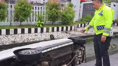 "Menabrak, mobil lalu terjatuh ke dalam saluran air," terangnya.
