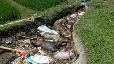 Luwu Timur, tvOnenews.com - Puluhan bangkai ternak babi menumpuk di saluran irigasi, desa Rinjani, kecamatan Wotu, kabupaten Luwu Timur, Sulawesi Selatan. Bangkai babi ini sudah mengeluarkan aroma busuk dan menganggu warga sekitar.