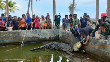 Selayar, tvOnenews.com - Proses evakuasi pemindahan buaya berukuran besar kurang lebih 5 meter dengan berat kurang lebih 300 kilogram yang berusia sekitar 30 tahun, pada Rabu (31/5/2023) berlangsung dramatis.