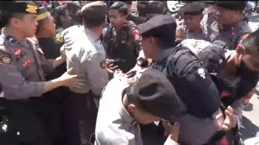 Makassar, tvOnenews.com - Unjuk rasa warga Bara-baraya menolak penggusuran di depan Pengadilan Negeri Makassar terkait sidang putusan sengketa lahan Bara-baraya berlangsung ricuh, warga terlibat aksi saling dorong dengan polisi, Selasa (13/6/2023).