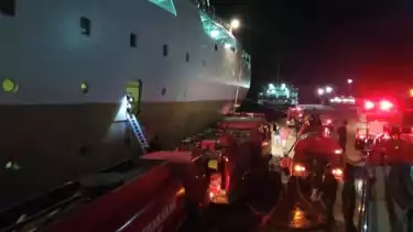 Parepare, tvOnenews.com - Kapal milik PT Pelni KM Bukit Siguntang terbakar saat hendak sandar di pelabuhan Nusantara, kota Parepare, Sulawesi Selatan Jumat (16/6/2023). Asap tebal terlihat dari atas dek 5 kapal tersebut. Para penumpang yang panik berebutan untuk turun menghindari asap tebal.