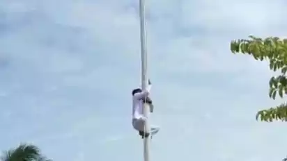 Gorontalo, tvonenews.com - Aksi heroik dipertontonkan pelajar SMA Negeri 9 Gorontalo Utara, Riski Lamato, menyelamatkan tali di tiang bendera yang putus pada saat upacara kemerdekaan Hari Ulang Tahun (HUT) RI ke 78 tingkat Kecamatan Sumalata Timur.