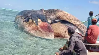 Selayar, tvOnenews.com - Seekor ikan paus raksasa dengan panjang kurang lebih 18 meter dan berat kurang lebih 10 ton terdampar di gugusan karang Takalambena, perairan laut Desa Karumpa, Kecamatan Pasilambena, Kepulauan Selayar, Sulawesi Selatan pada Sabtu (19/8/2023).