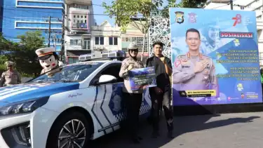 Makassar, tvOnenews.com - Ditlantas Polda Sulawesi Selatan (Sulsel) menggelar sosialisasi penerapan ETLE Mobile on Board dan ETLE Mobile Handheld atau Handphone ditengah pelaksanaan car free day yang berlangsung di Jalan Boulevard Makassar, Minggu (27/8/2023).