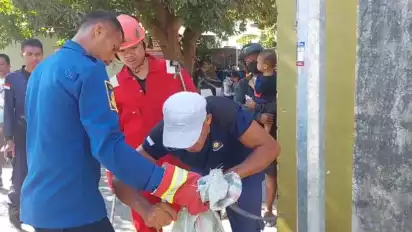 Petugas Resque Damkar akhirnya hanya membawa satu ekor biawak berukuran 1 meter yang sebelumnya berhasil ditangkap warga. (jai/frd)