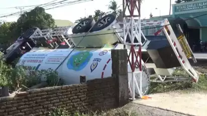 Maros, tvOnenews.com - Truk tangki berkapasitas 12.000 kilogram gas LPG terbalik di Jl Poros Bantimurung, Kabupaten Maros, Sulawesi Selatan. Truk tersebut awalnya terperosok ke dalam galian pelebaran jalan.