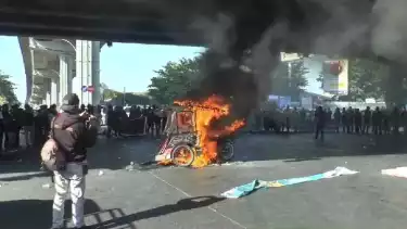 Tidak berselang lama, massa membawa sebuah becak bentor untuk dibakar di tengah badan jalan.