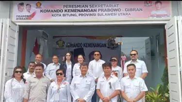 Bitung, tvOnenews.com - Wakil Ketua Dewan Pembina DPP Partai Gerindra yang juga adik Prabowo Subianti, Hasim Djojohadikusumo resmikan Sekretaiat Komando Kemenanangan Prabowo-Gibran dan sampaikan program prioritas Prabowo-Gibran di dalam kunjungannya di kota Bitung provinsi Sulawesi Utara, Sabtu (4/11/2023).