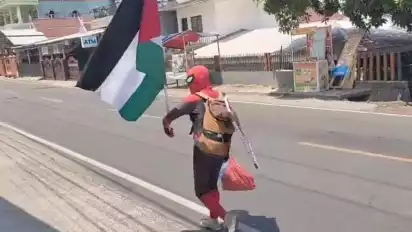 Makassar, tvOnenews.com - Seorang pria berkostum spiderman melakukan aksi longmarch peduli Palestina, dari Kota Pare-Pare menuju Kabupaten Gowa, Sulawesi Selatan. Dengan berjalan kaki sejauh 160 km ia menggalang dana.