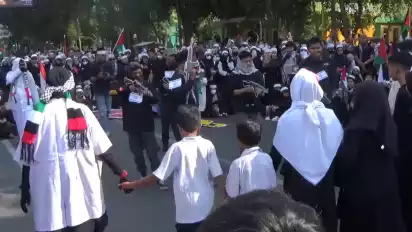 Ratusan pengunjuk rasa membawa poster berisi seruan dukungan kepada Palestina dan memakai ikat kepala sebagai bentuk dukungan mereka.