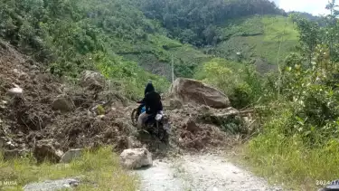 Akibat tingginya material longsor menimbun jalan poros desa, kendaraan roda dua yang ingin melintas di jalur yang tertimbun longsor sulit untuk melintas.