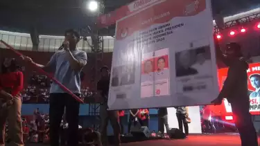 Kaesang kemudian menyampaikan cara memenangkan paslon nomor urut 2 dengan menusuk gambar wajah Gibran di bagian matanya dengan simulasi surat suara.